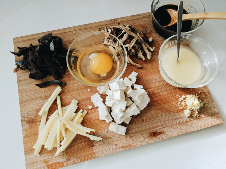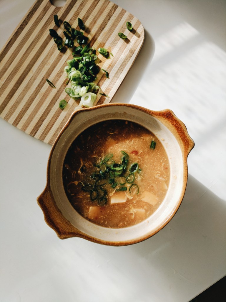 I reconstituted a few dried shiitake and woodear mushrooms in hot water, and I thinly sliced them. I put a pot of chicken stock on the stove to boil. To the pot, I added fresh grated ginger, soy sauce, chili garlic sauce, black vinegar, and white wine vinegar (use red vinegar or rice wine vinegar if you have it). Then I thinly sliced canned bamboo shoots and chopped up a fresh block of firm tofu. Throw the mushrooms, tofu, and bamboo into the boiling pot of soup. This is where I added a ridiculous amount of white pepper. Next, I stirred in a slurry of corn starch and chicken stock. The corn starch will thicken the soup as it cools. I turned the stove on low, and slowly drizzled in a beaten egg. I used a fork to stir the egg around the soup to form shreds.