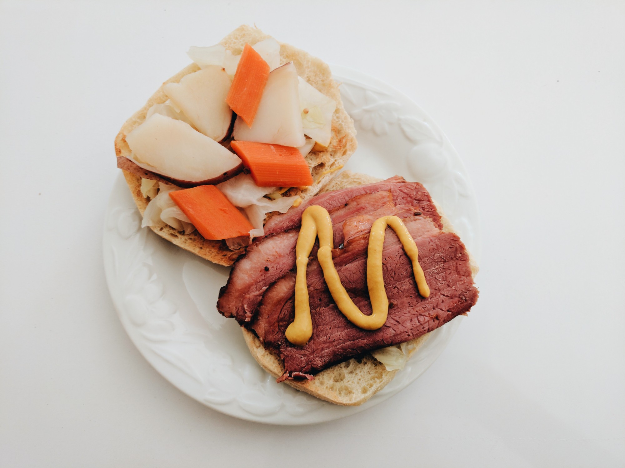 After hours of slaving away in the kitchen, cooking Thanksgiving or Christmas dinner, what’s the most dignified way to utilize the leftovers? Sandwiches, of course. St. Patrick’s Day is no different. On a toasted roll, I piled on the leftovers from my third favorite meal of the year. Thinly sliced corn beef, cabbage, carrots, potatoes, horseradish, and mustard.