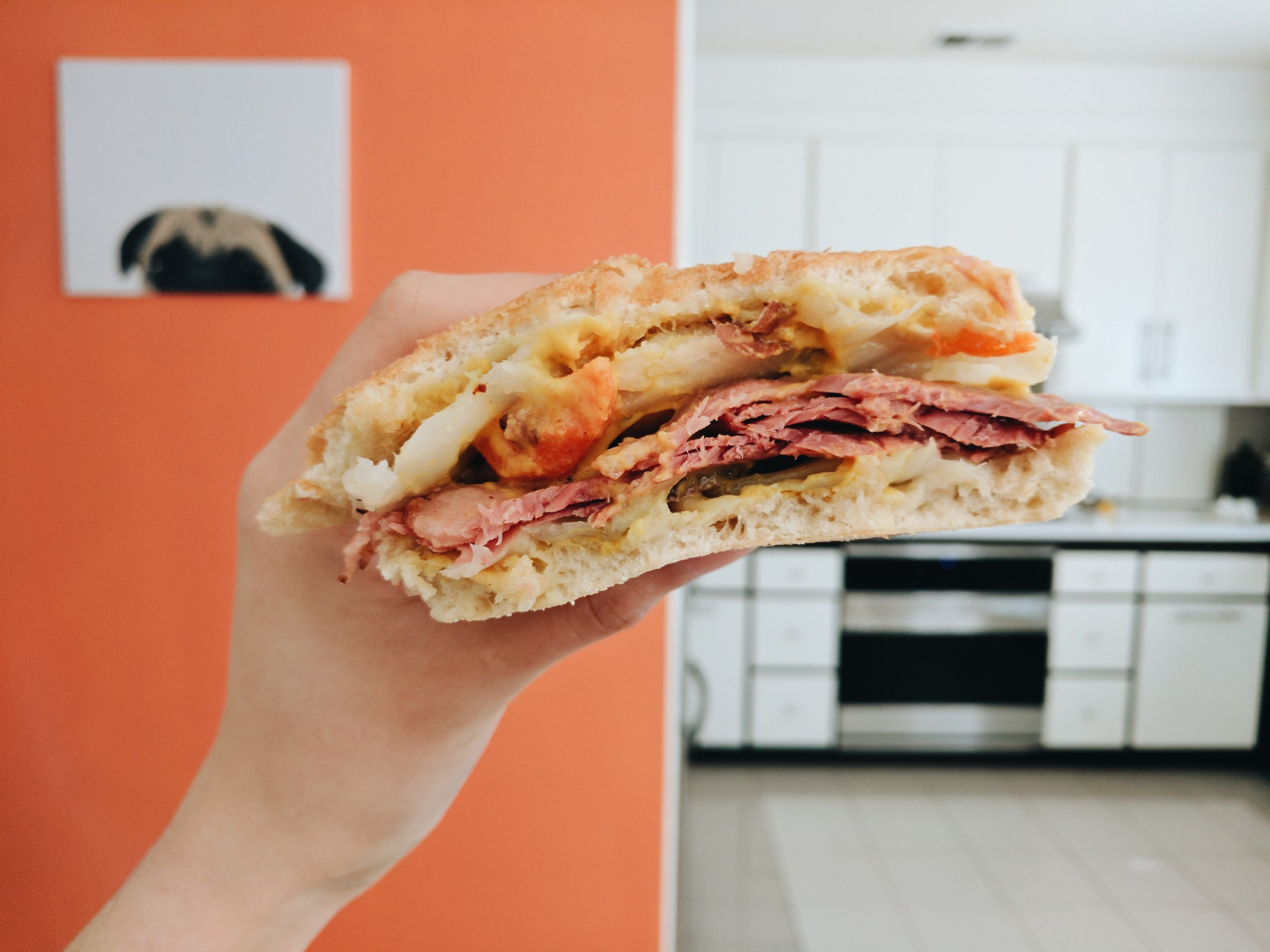 I considered going to the store to pick up some Swiss cheese, but I couldn’t bear to leave my pathetic pupper home alone. If I had Swiss cheese on hand, you best believe I would’ve turned this sandwich into a crispy, melty, panini.