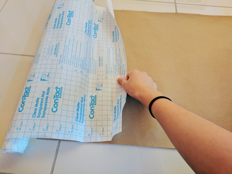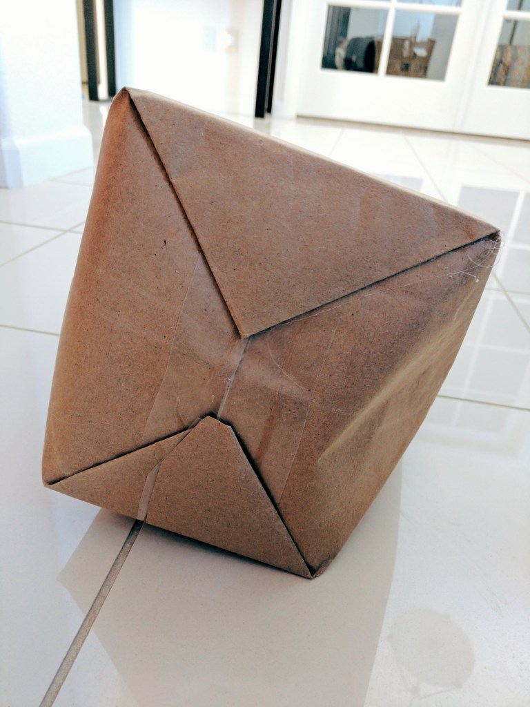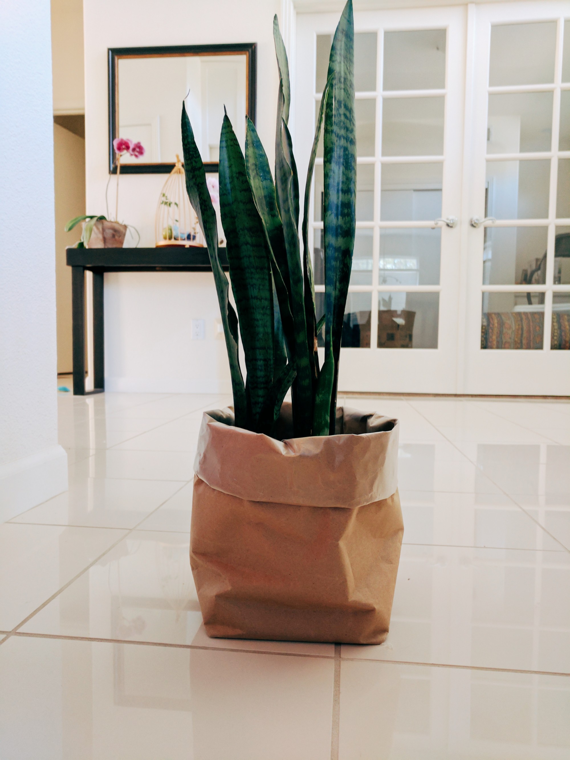 I’m into the ‘paper bag’ planter trend. I picked up a roll of kraft paper and a roll of clear contact paper from the hardware store. I simply cut a rectangle of the kraft paper and stuck the same sized rectangle of contact paper on top of the kraft paper. Apparently, contact paper isn’t as sticky as I thought it would be. As long as the inside is covered and the seams are reinforced with lots of glue and tape, the bag should be fine.