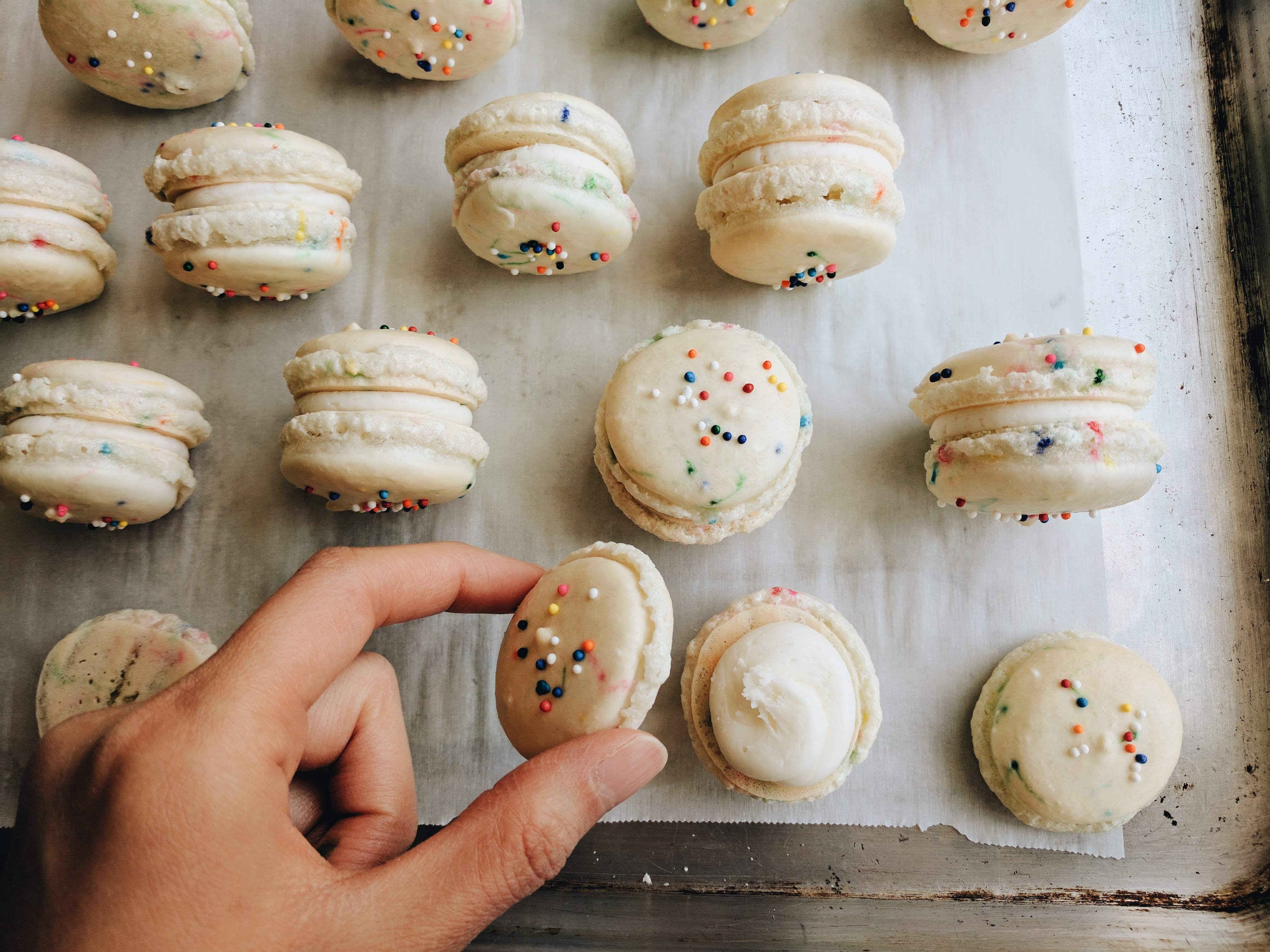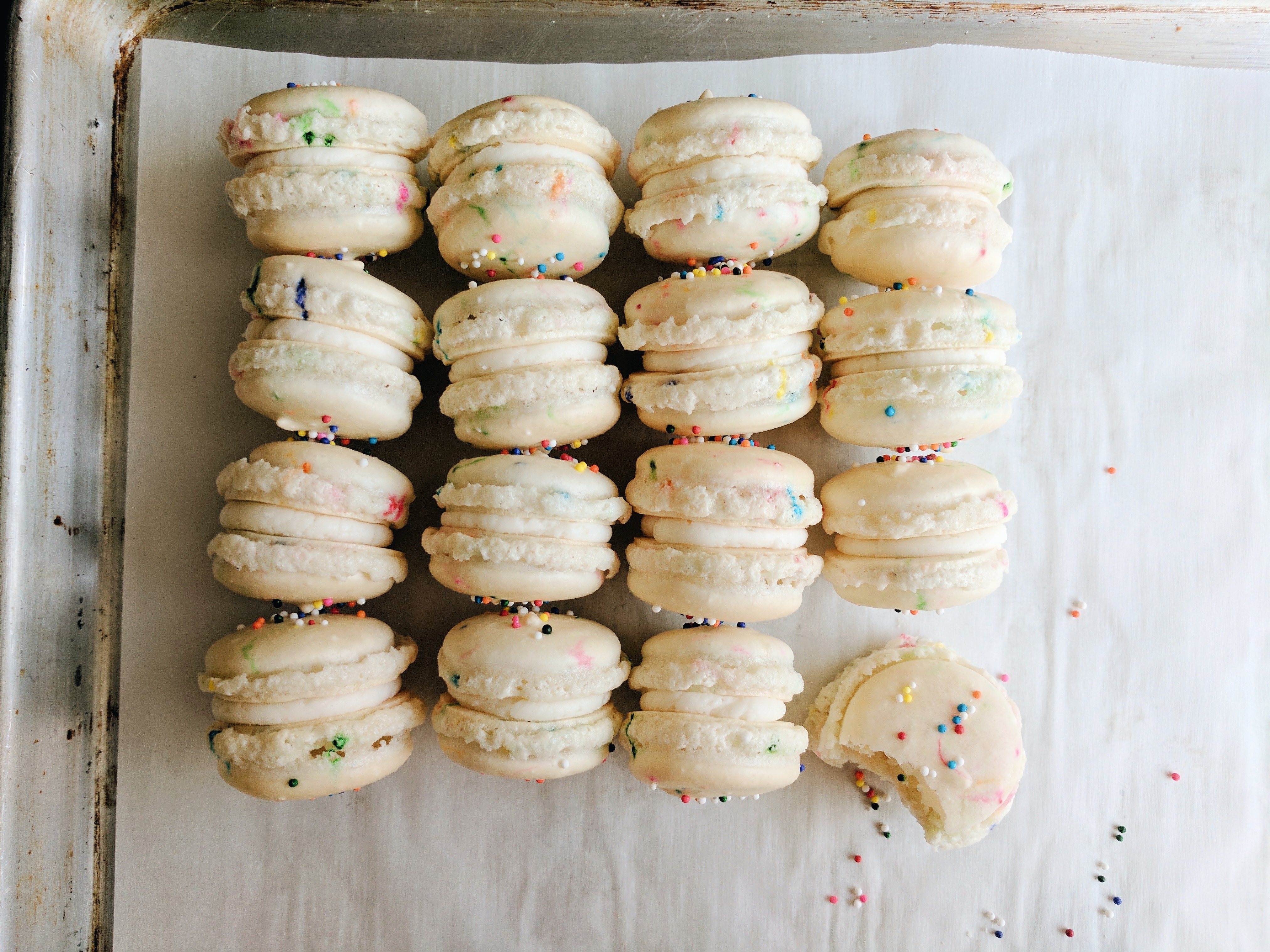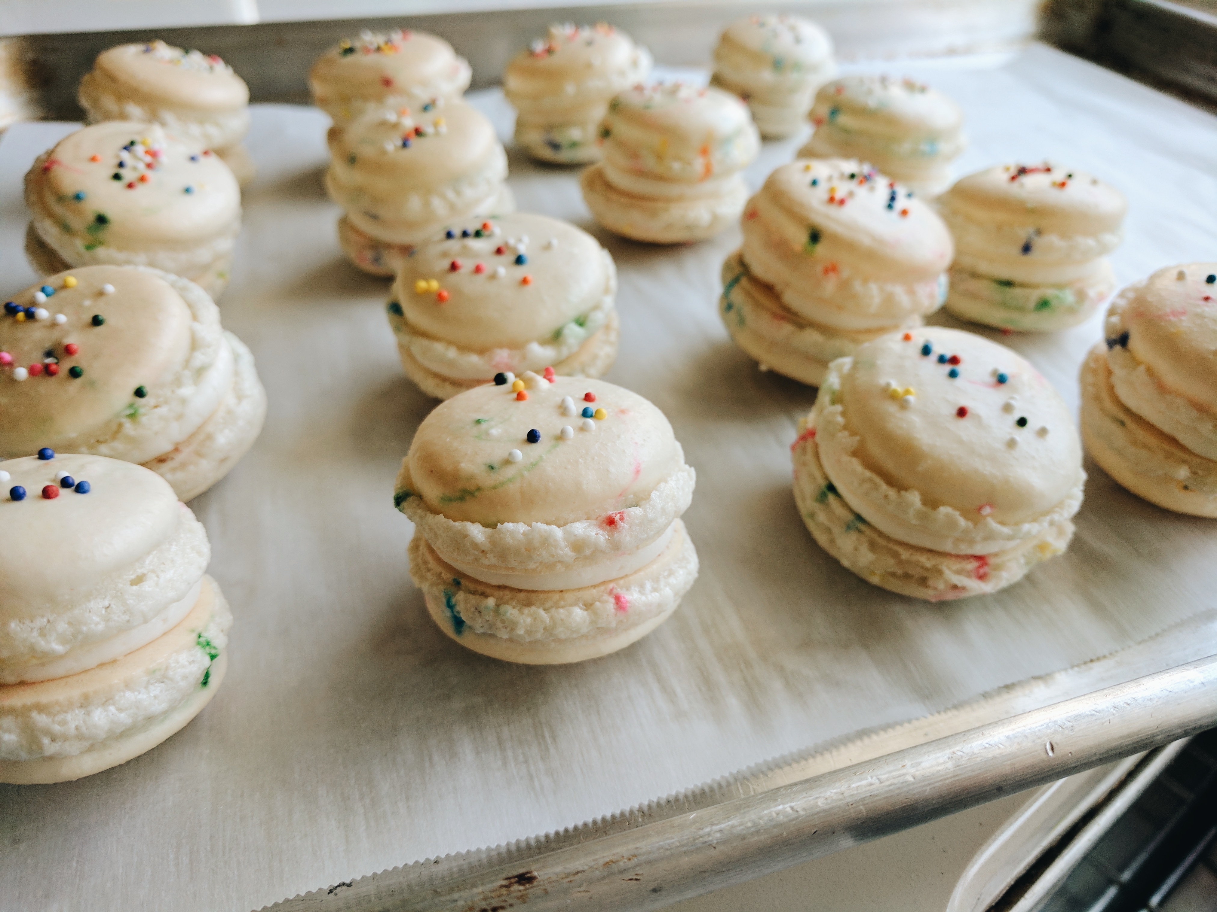 Macarons are a finicky food to make. So many factors determine whether macarons will turn out or not (temperature, humidity, weight measurements, etc.). When I first started making macarons during my college years, I lucked out every single time. I had fun creating different flavor combinations. Coffee shells with Kahlua buttercream, raspberry shells with lemon buttercream and berry preserves, cayenne cocoa shells with chocolate ganache, Earl grey shells with lemon and honey buttercream, and many more. I don’t even care for macarons, I definitely have more of a salty tooth than a sweet tooth! I kept making them because it was a challenge and I love proving a point. Around this time last year, I decided to try doubling a recipe, since one batch will typically only make 12-18 macarons. I should’ve known better than to alter a macaron recipe. It was my first ever failed batch of macarons and it was a huge blow to the ego. Today I tried to redeem myself, only to toss yet another failed batch. I took note of all of my failures (overmixing, using the wrong sized piping bag tip, low oven temperature) and tried again. The second batch turned out a little better, as pictured. Not pictured are the hollows of each shell, which is not a favorable macaron trait. Nobody’s perfect!!!