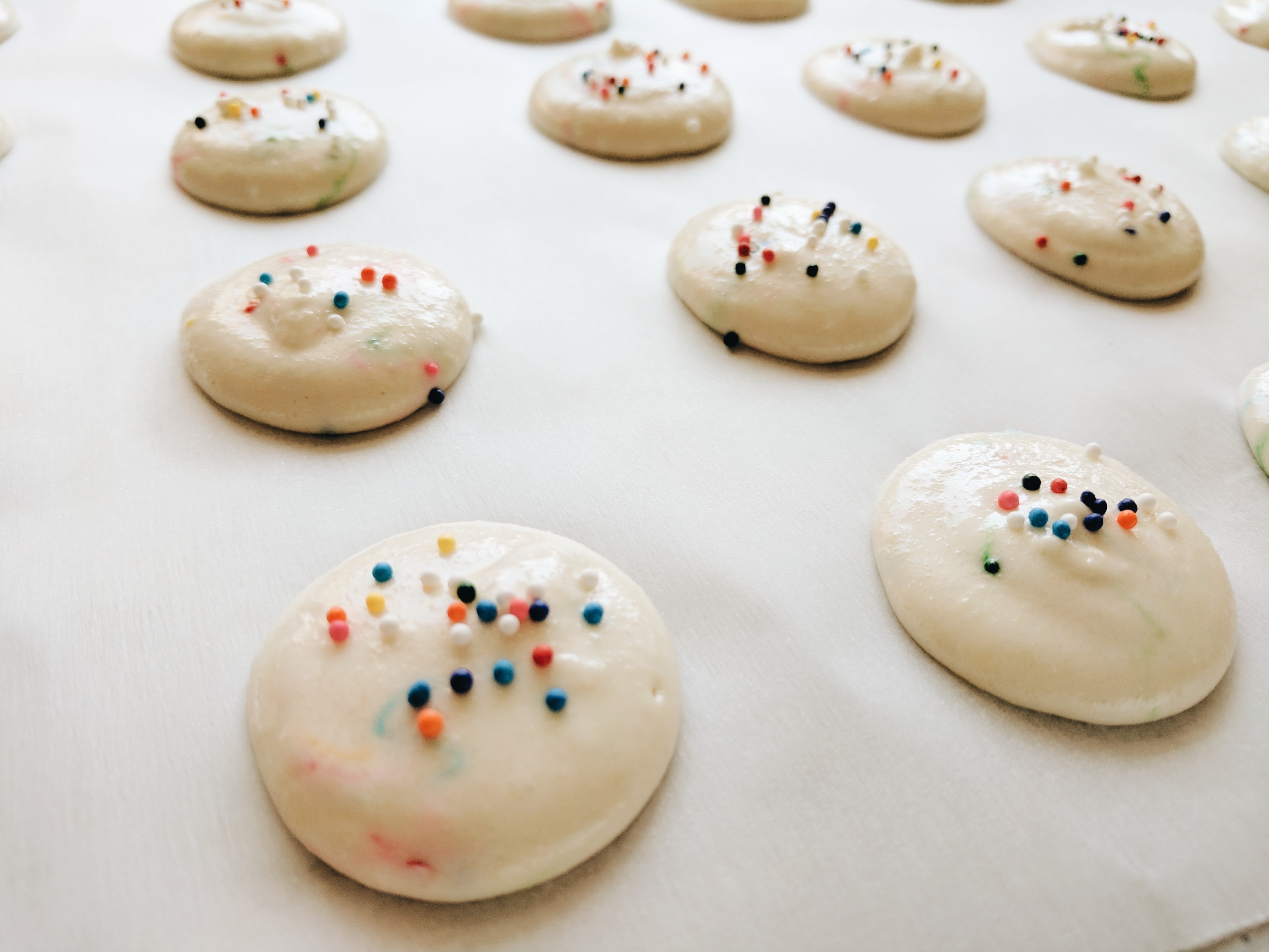 I piped 1 inch circles on parchment paper, and rapped the pan on the counter a few times to help the macarons spread and to pop any air bubbles that might’ve formed. One of the most crucial steps is to let the macarons sit, undisturbed, for at least 30 minutes. This will allow the batter to form a shell, and to help it grow ‘feet’ in the oven. A humid day can ruin this step!