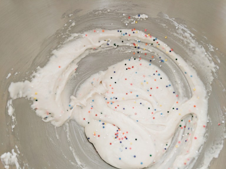 I folded the dry ingredients into the eggs by scraping around the edge of the entire bowl, cutting through the middle of the batter, and repeating about 40 times. When the batter felt ready (seriously, you just have to know), I folded in some sprinkles.