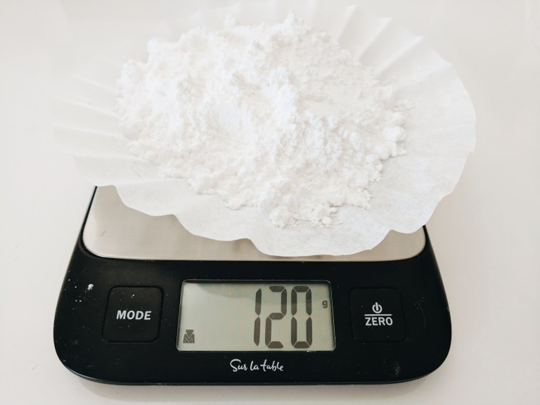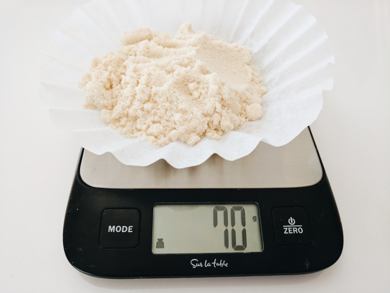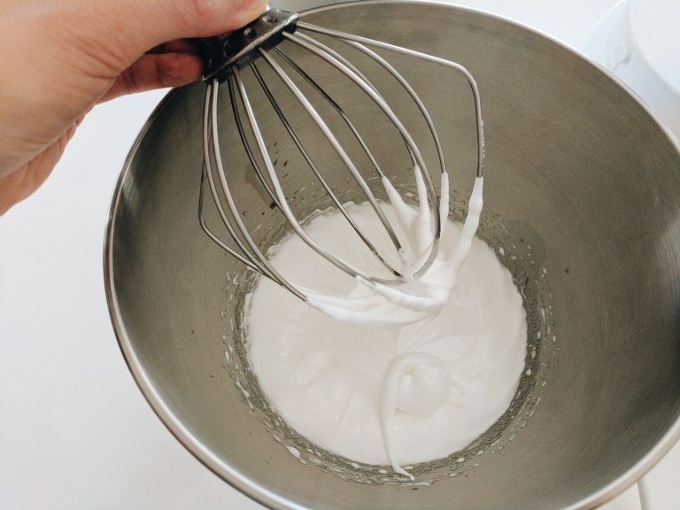 I measured out 70g of almond flour and 120g of confectioner’s sugar. Then I combined them and processed them in the food processor, and sifted out the clumps. I started beating 2 room temp egg whites on low, gradually adding 1/4 cup granulated sugar and a splash of vanilla. Then I turned the mixer on high until glossy peaks formed.
