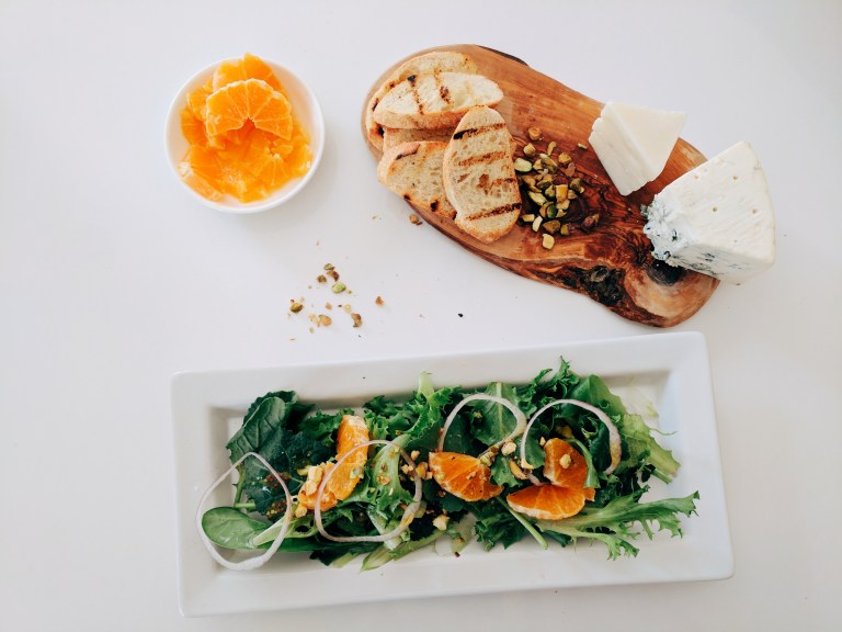 I made a quick salad with baby kale and celery. For a vinaigrette, I whisked together some apple cider vinegar, whole grain mustard, honey, lemon, salt, pepper, and olive oil. I topped the salad with some red onion, crushed pistachios, shaved Pecorino Romano, and segments of the last few oranges from our backyard tree.