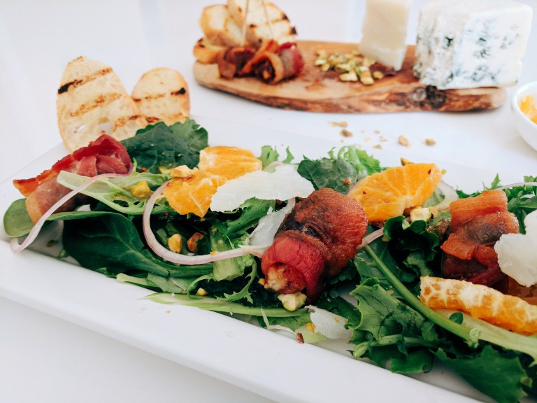 Bacon Wrapped Stuffed Dates and Baby Kale Salad
