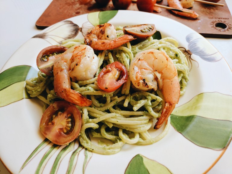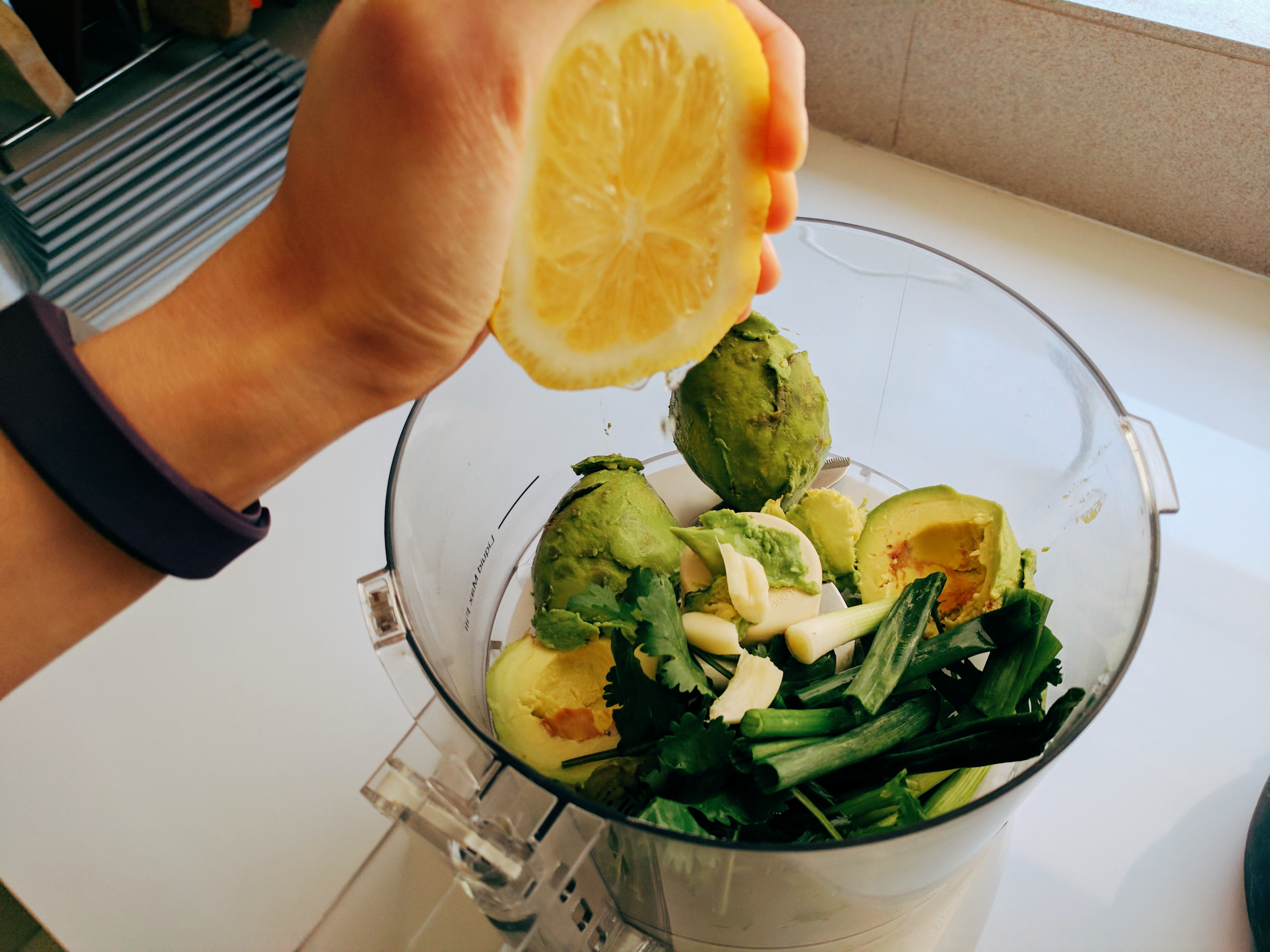 Ideally, I would’ve used avocados and basil as the base of this pasta sauce, but our basil plant is completely wilted. So I used green onion and cilantro instead. Not the taste I was going for, but still a taste. I processed together the flesh from two avocados, juice from half of a lemon, a garlic clove, two green onions, and a handful of cilantro. I let the processor run while I drizzled in some olive oil and salt/pepper.