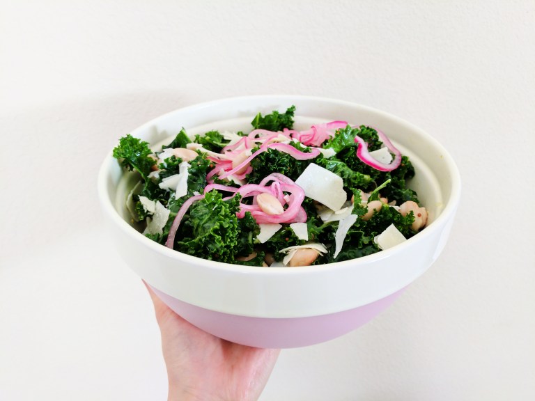 I washed a bundle of curly kale and separated the ribs from the leaves. Then, I used a sandwich bag as a makeshift glove, and massaged the following into the kale: olive oil, lemon juice, whole grain mustard, sesame paste, salt, and sugar. Massaging kale seriously makes a difference. If you’ve ever had raw kale that wasn’t massaged first, you’re probably lying if you say you enjoyed it. Massaging each leaf really helps break down the tough texture and gives your jaws a break. It’s cool to see the leaves get darker and more tender. After massaging, my bundle of kale reduced to half the original volume.
