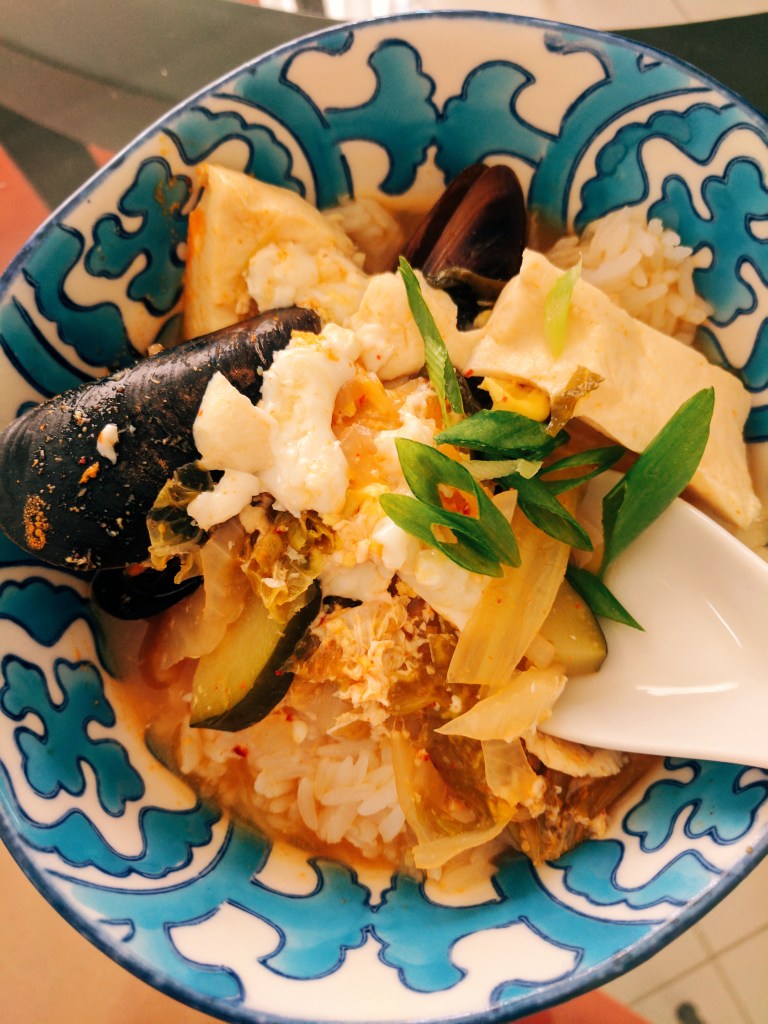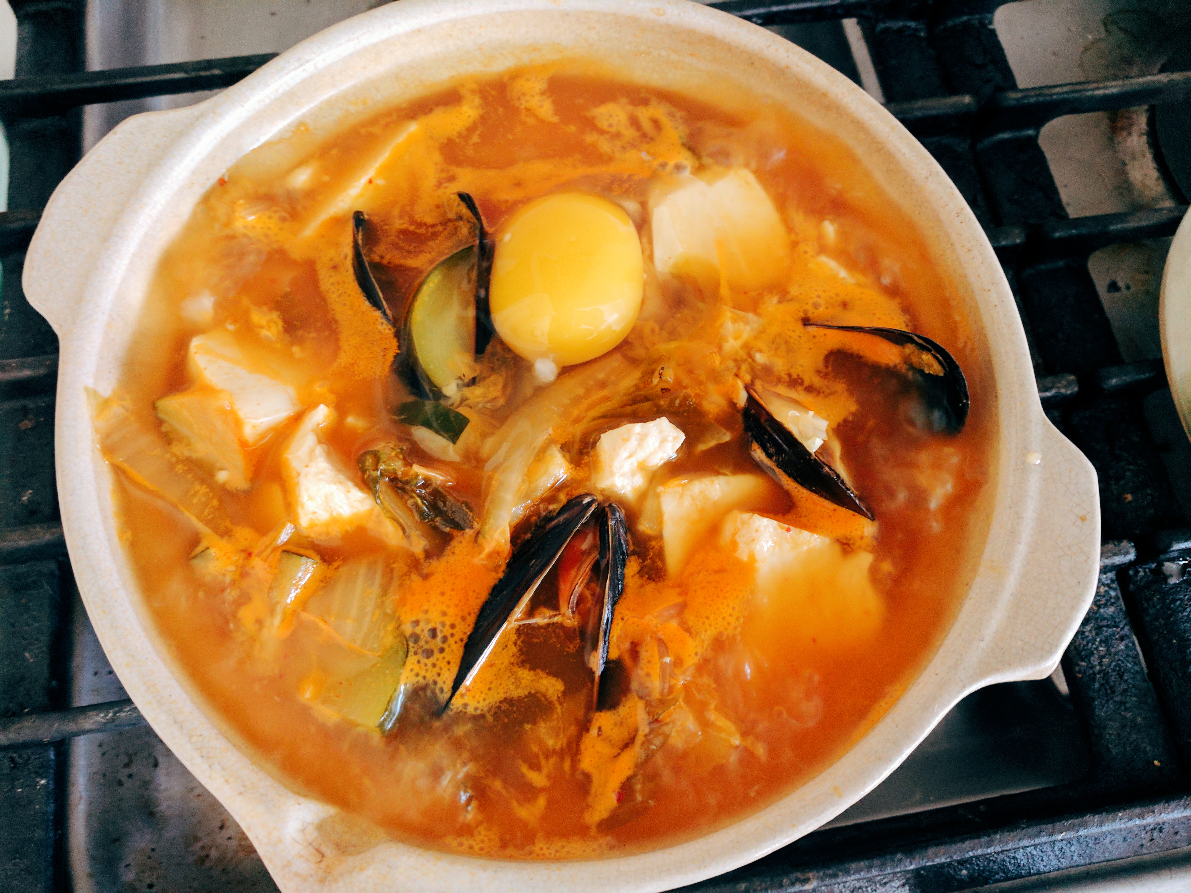 Haemul sundubu jigae. Kelp and bonito stock, kimchi, soft tofu, gochugaru, zucchini, garlic, onion, and fresh mussels.