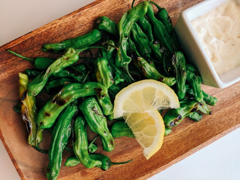 Kkwarigochu. Aka shishito peppers, lightly drizzled with olive oil, blistered on a grill pan, and dipped in lemon garlic mayo.