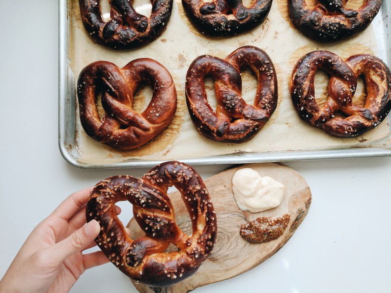 I was the kid who was more interested in mall pretzels than mall shopping. I’ll always have a soft spot for those buttery, salty, Auntie Anne’s pretzels. The difference between mall pretzels and Bavarian pretzels is the color and texture. Authentic pretzels have that dark, shiny, and chewy outside, with a soft inside.