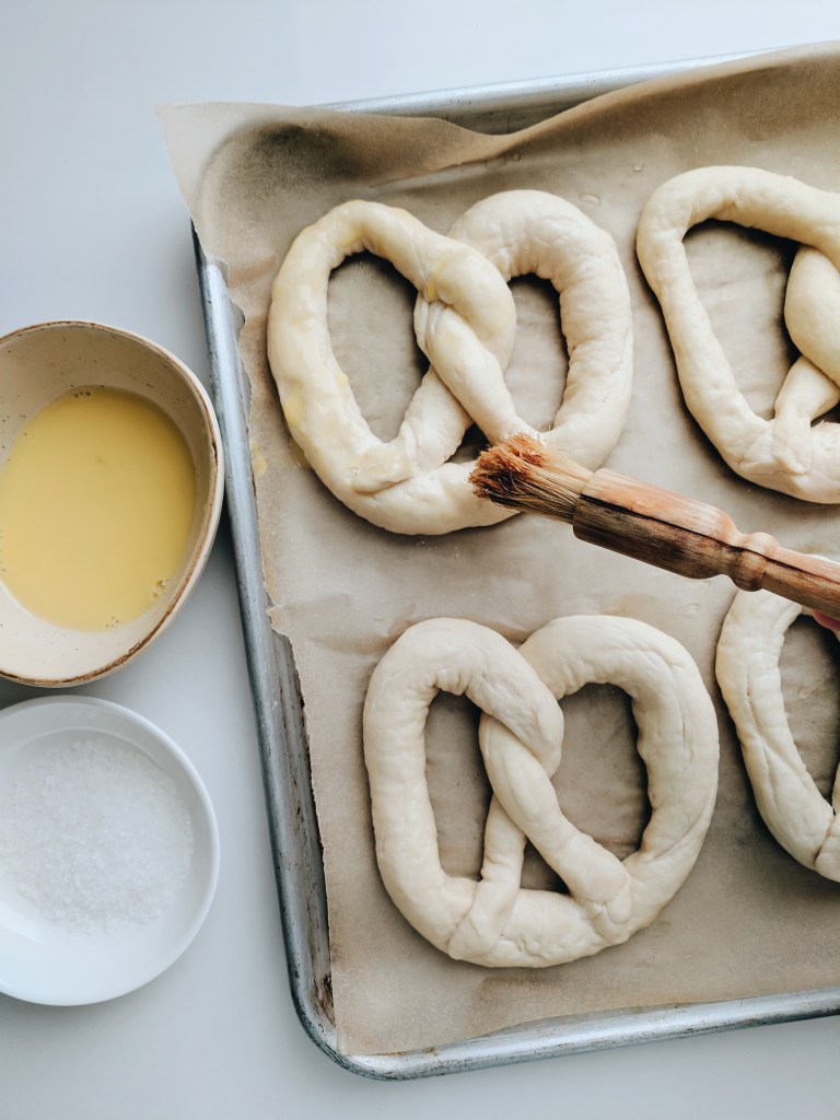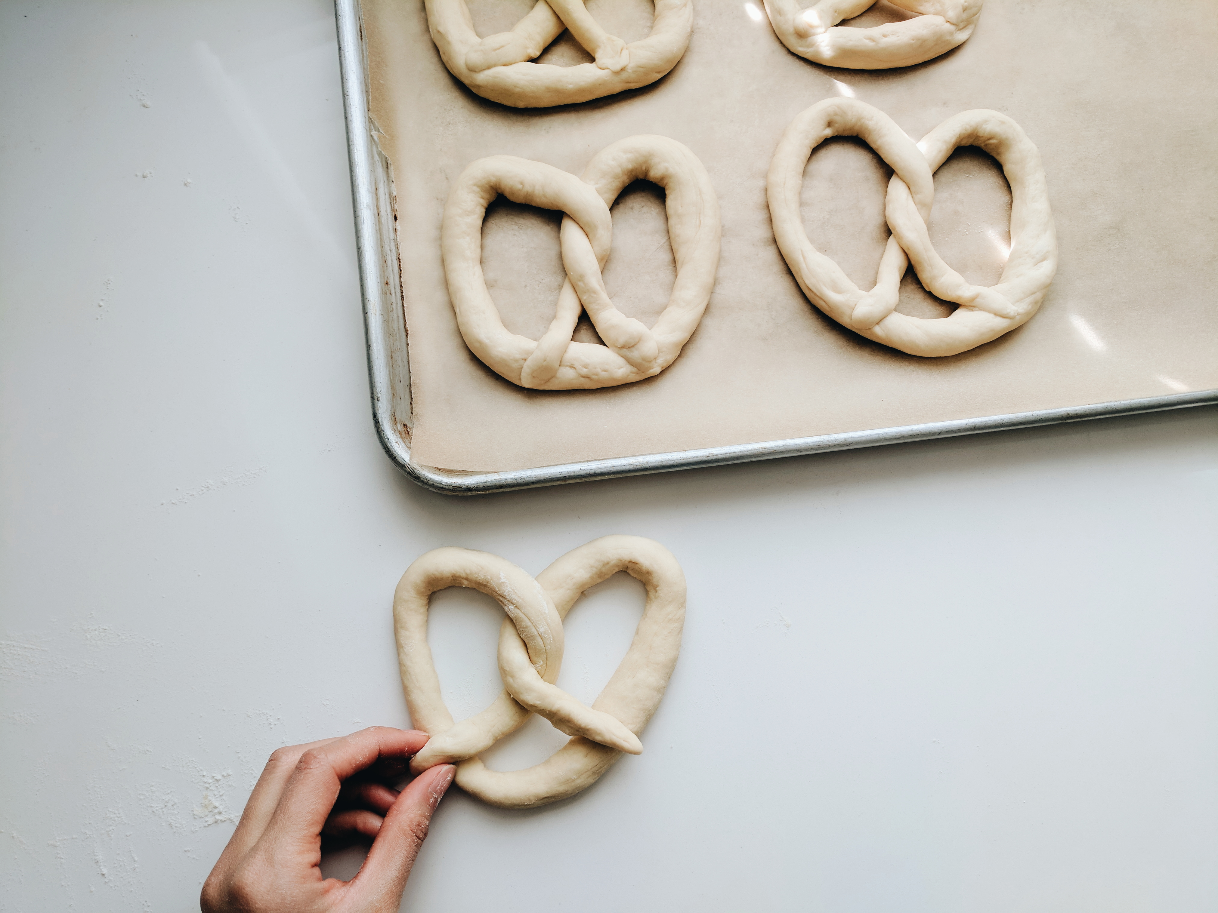 To Maillard recation is responsible for the caramel color. Traditional pretzels are dipped in a lye mixture. Since I’m not trying to risk my life making pretzels, I used baking soda instead. Boiling the pretzels in baking soda and water for a few seconds before baking will cause a reaction between carbs and amino acids and create that caramel color after baking for just a few minutes.