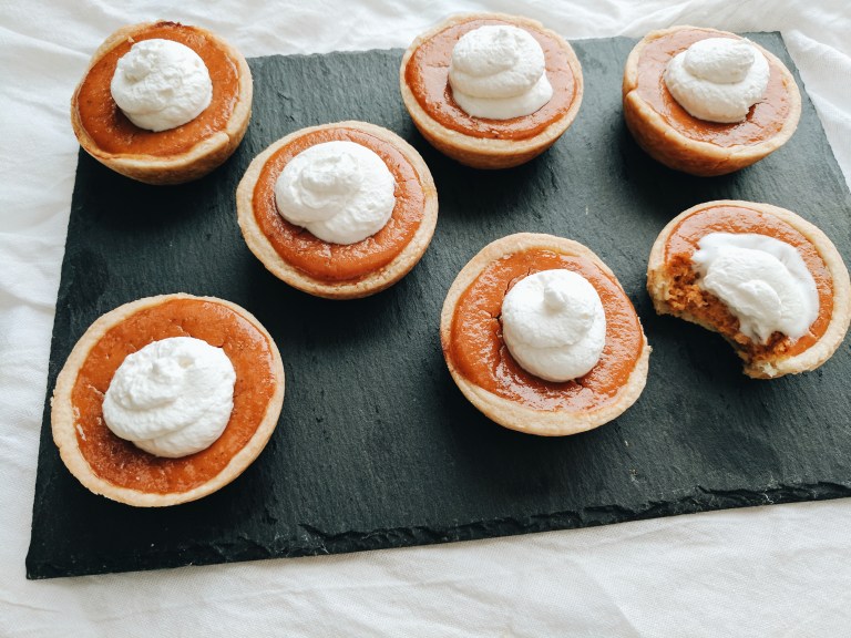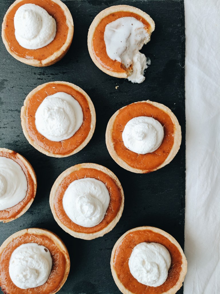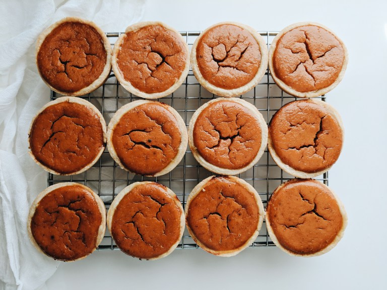 I really messed this one up. I will never make pumpkin pie again. I don’t even like pumpkin pie! Not only did overfill them, I accidentally steamed them instead of baking them (I placed the extra filling in a ramekin and cooked it in a water bath in the same oven as my pies…).