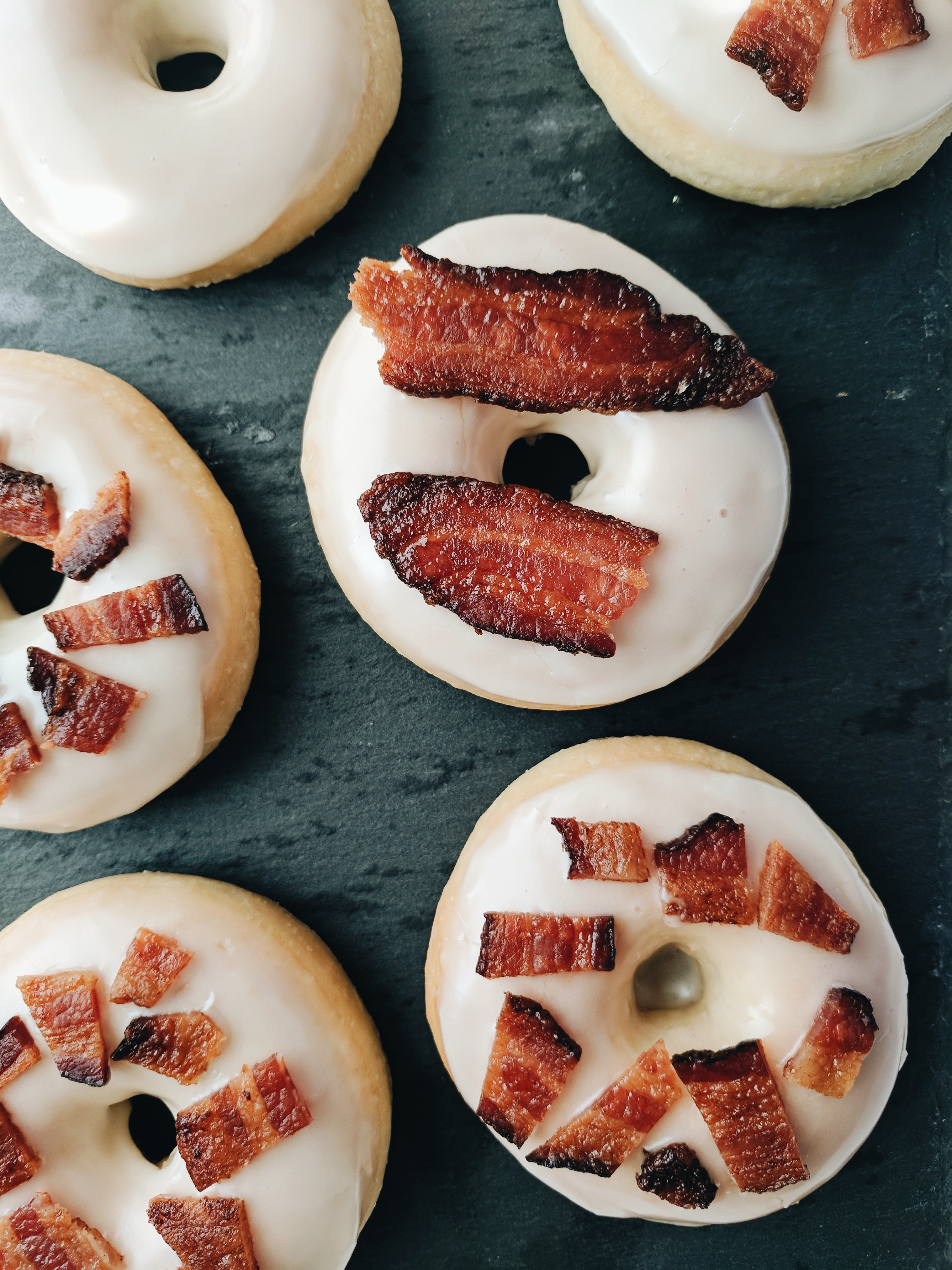 For the glaze, I mixed together powdered sugar with milk and maple syrup. I candied some thick-cut smoked bacon by cooking it on a wire rack in the oven at 375°F for 20 minutes. Then I brushed each side with a mix of brown sugar, maple syrup, and cayenne pepper. I continued to bake for another 10 minutes, repeated the brushing process, and baked for a final 10 minutes. Seriously divine.