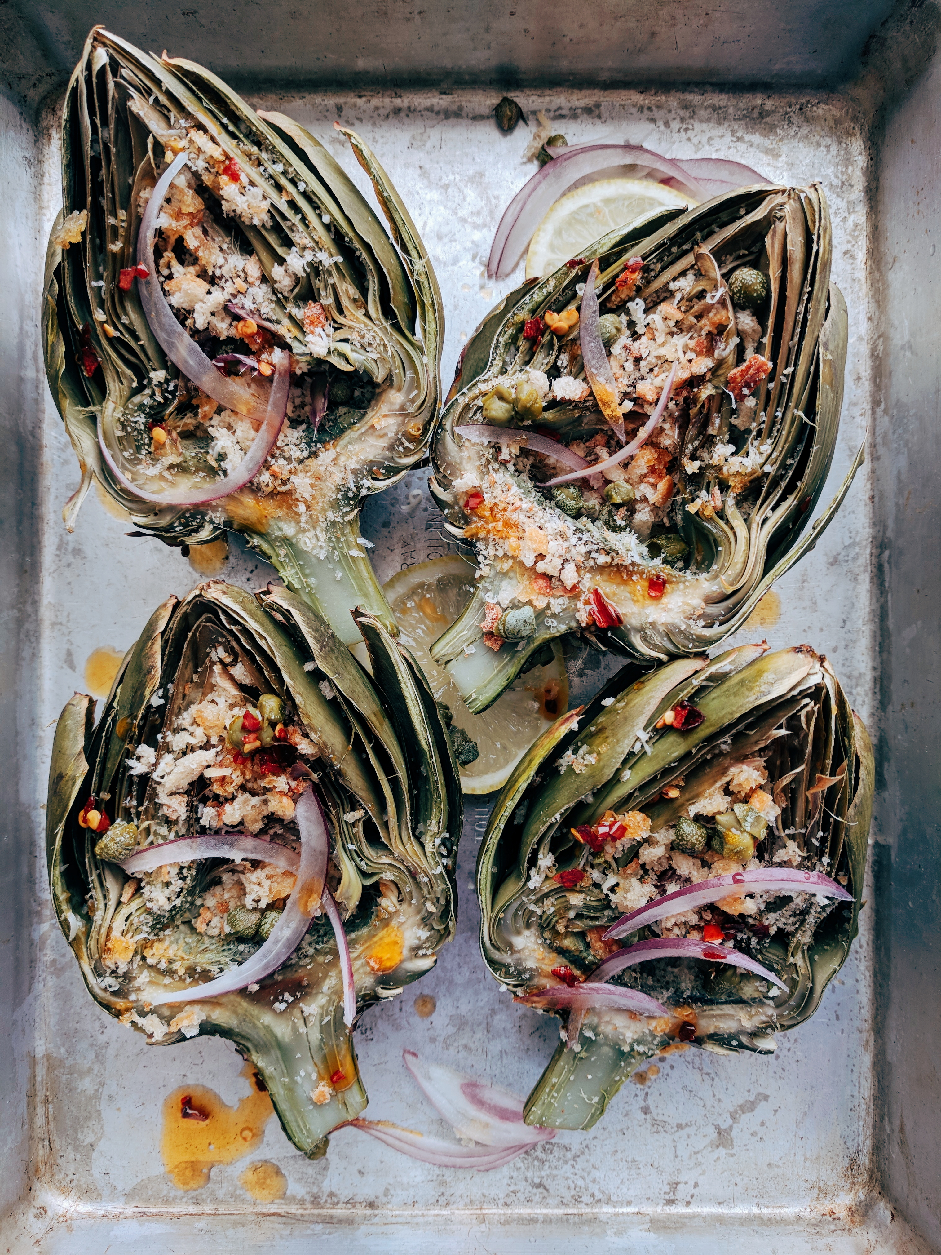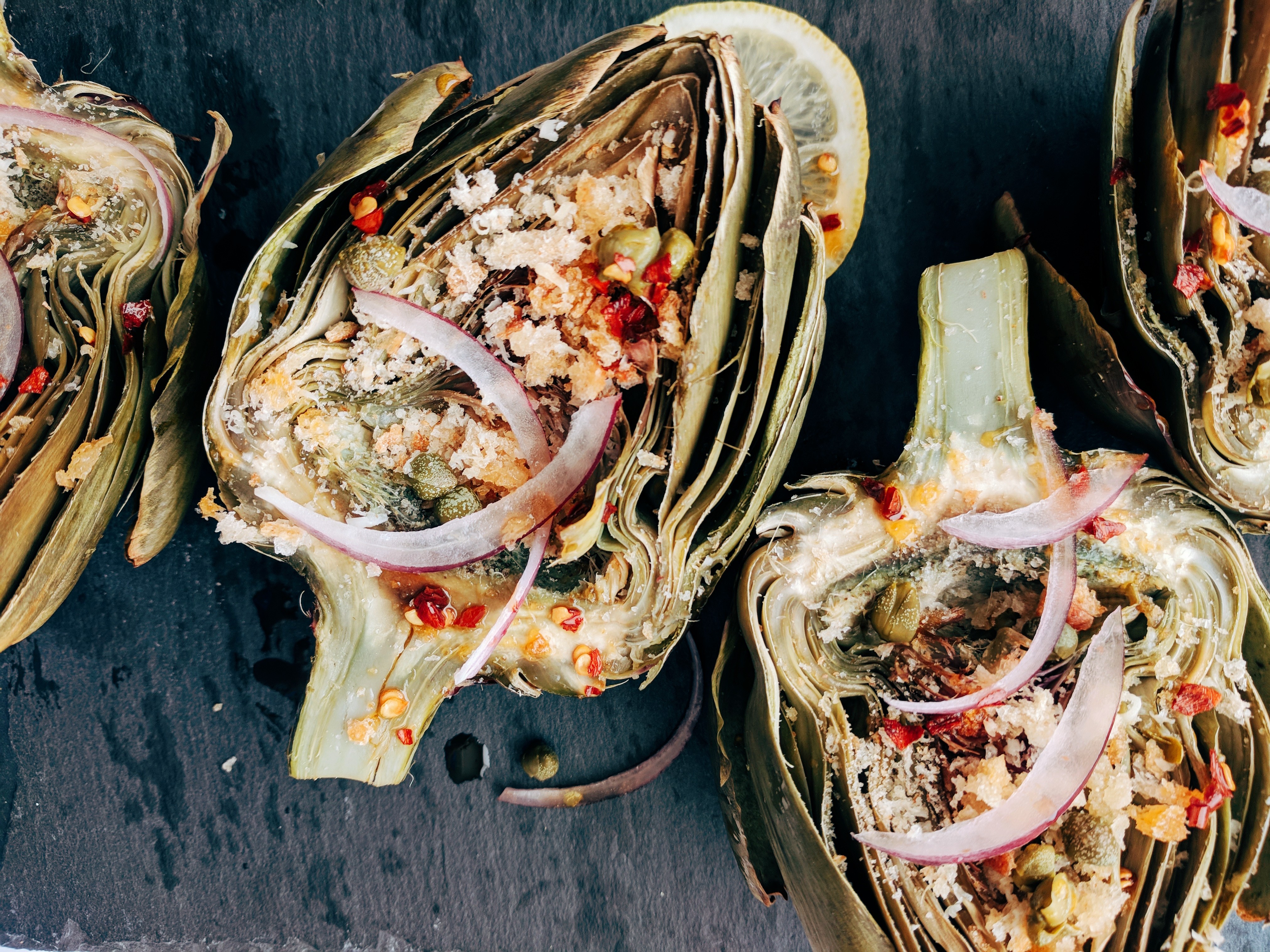 Step 6: Finish with lemon, capers, red onion, and chili garlic infused olive oil