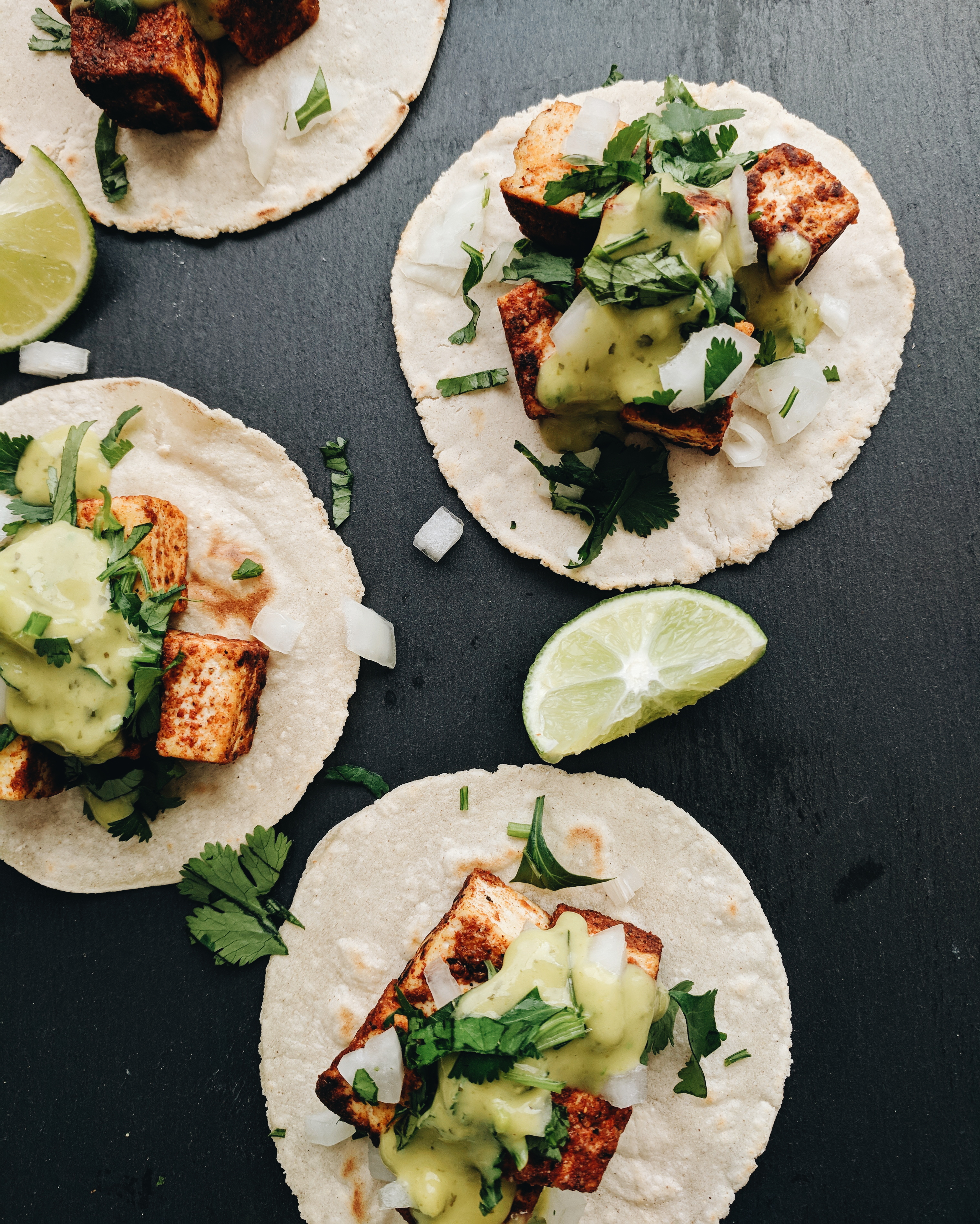 - In a pan, heat the tortillas on medium. Top the tortillas with the tofu, cilantro, onion, and avocado salsa .