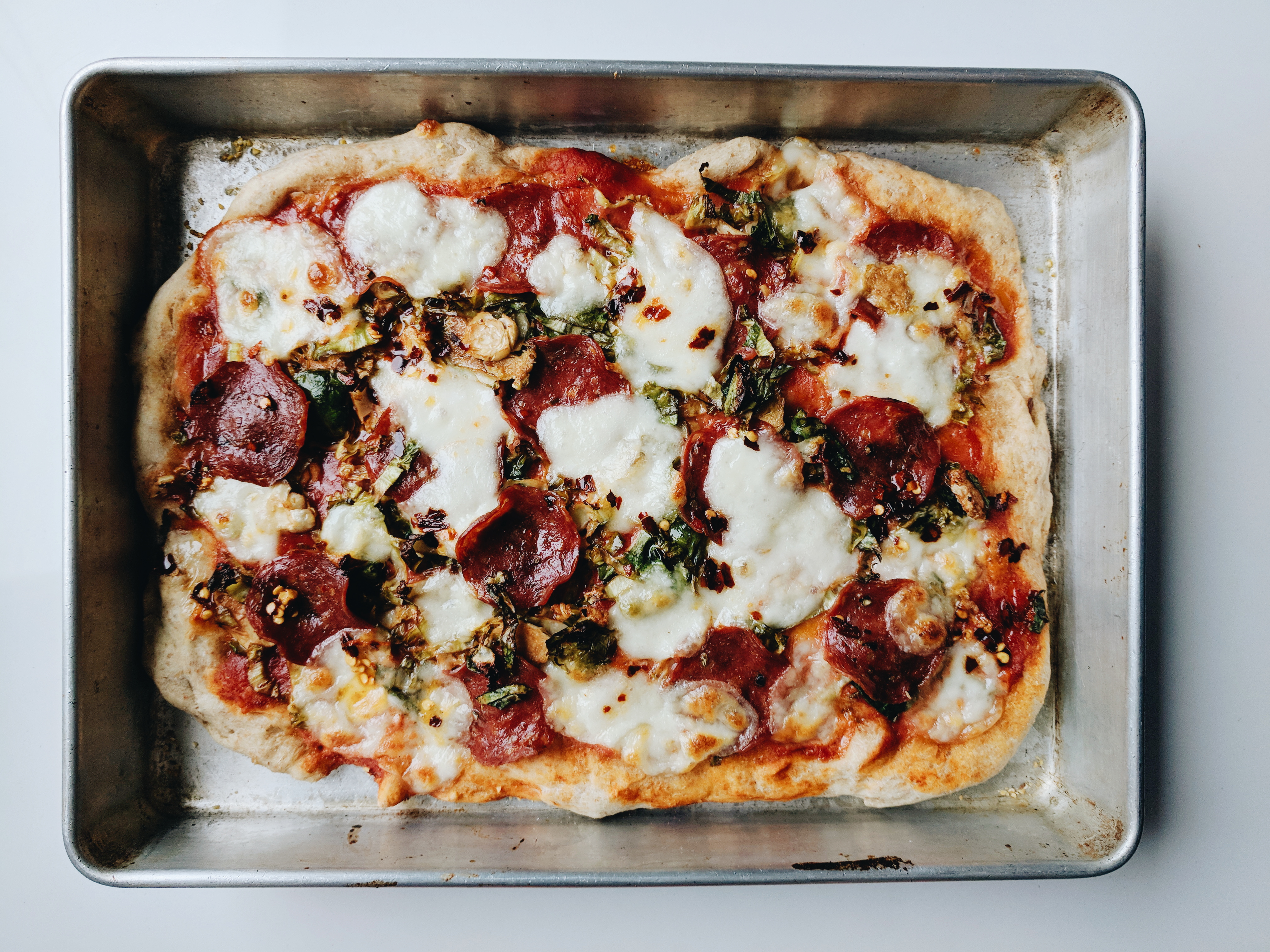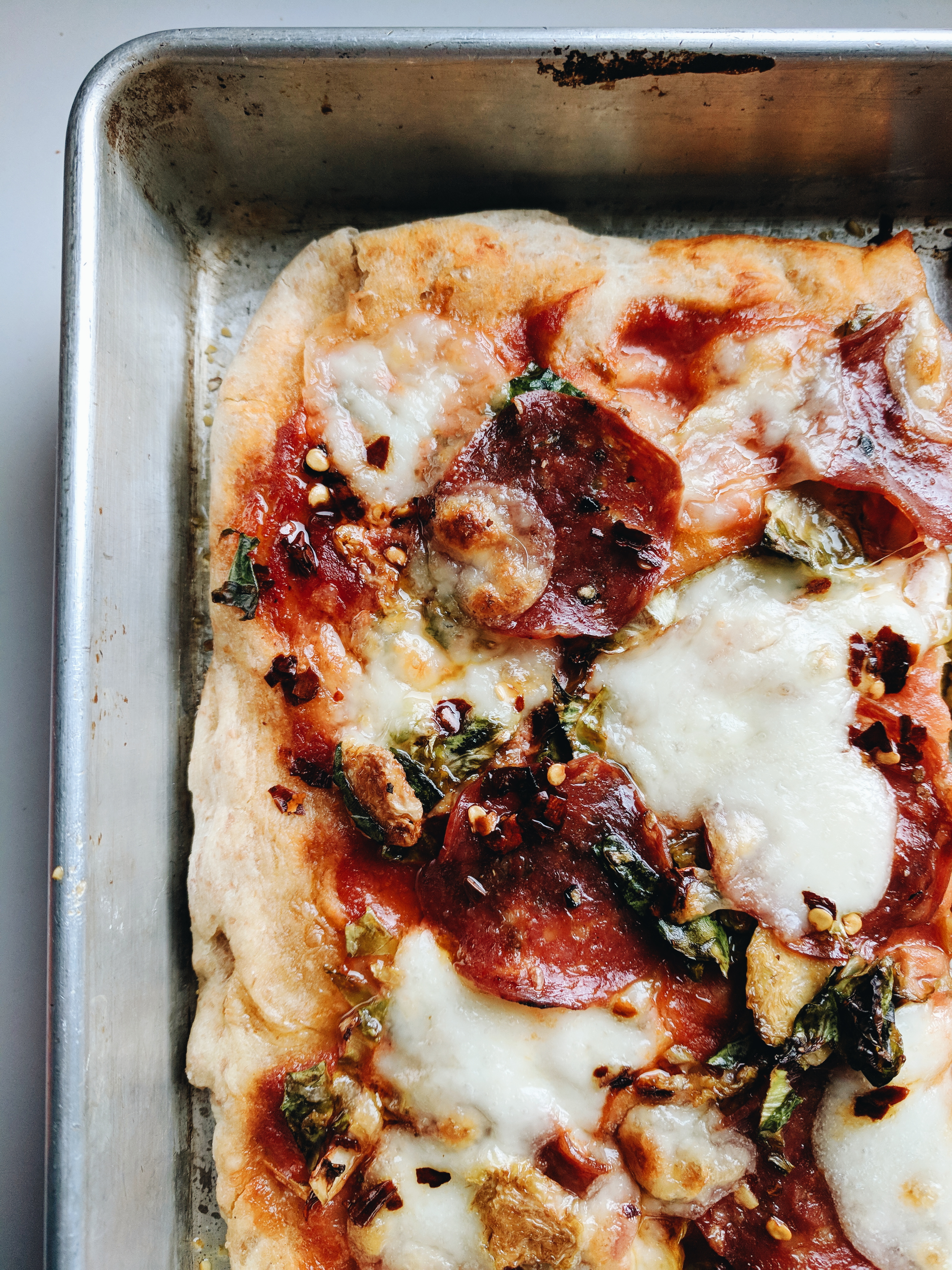 Let me preface this post by saying that today is the first time I’ve ever used store-bought pizza dough. It was pretty cheap and I was pretty lazy. I was already at the store, running out of natural lighting, and had absolutely no idea what to make for dinner. Then I saw some spicy Calabrese salami and remembered being inspired by a gorgeous pan pizza by @fortheloveofthesouth.
