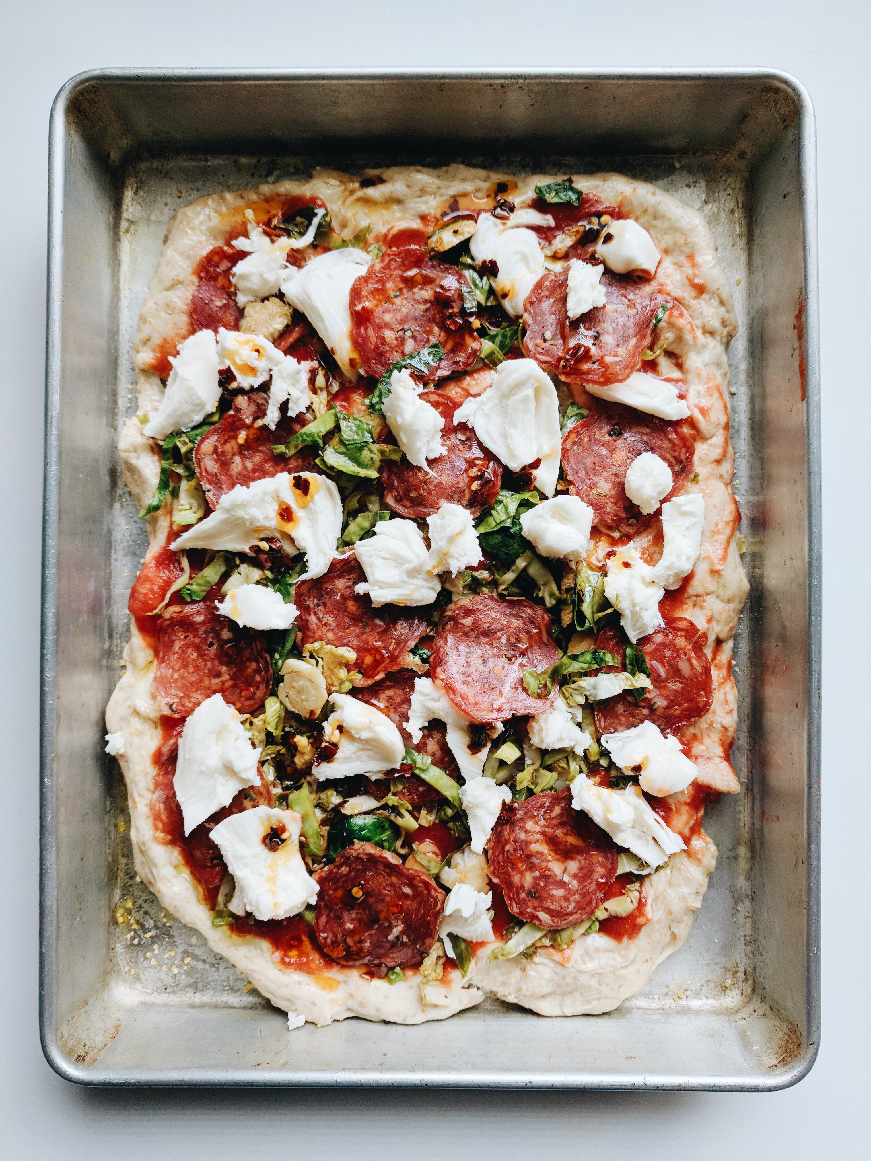 - Top the pizza dough with sauce, oregano, Brussels sprouts, mozzarella, salami, and a drizzle of chili oil.