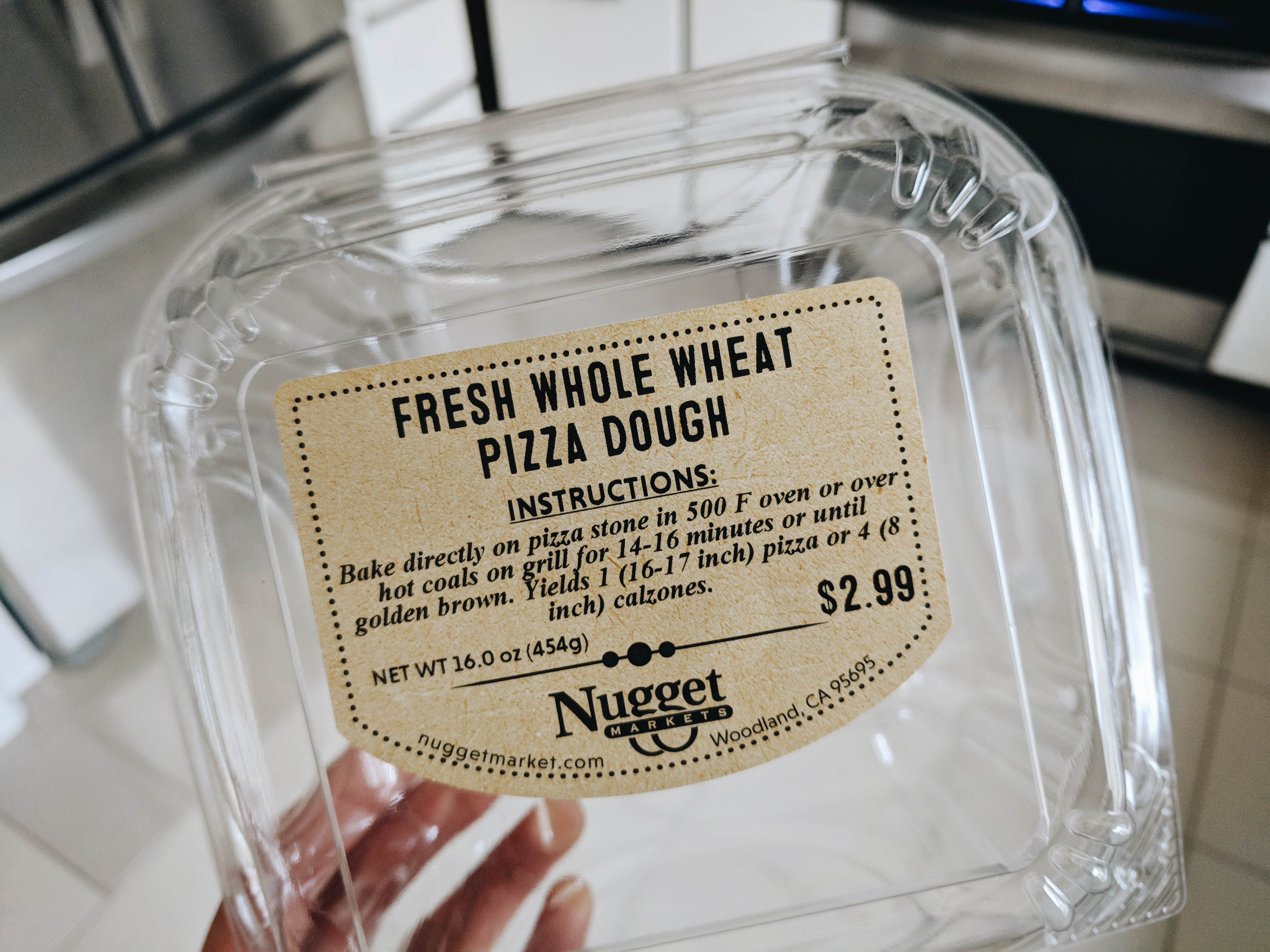 Based on the label alone, I assumed the ball of dough in the box was fresh, soft, and ready to bake (again, my assumption based on context clues). I got home, hurriedly cooked up some Brussels sprouts, preheated the oven, and got all of my pizza ducks in a row. I take the dough out of the box and it’s SOLID as rock, even though it came from the REFRIGERATED section of the store. I panicked and defrosted the dough in the microwave, which basically par-cooked it.