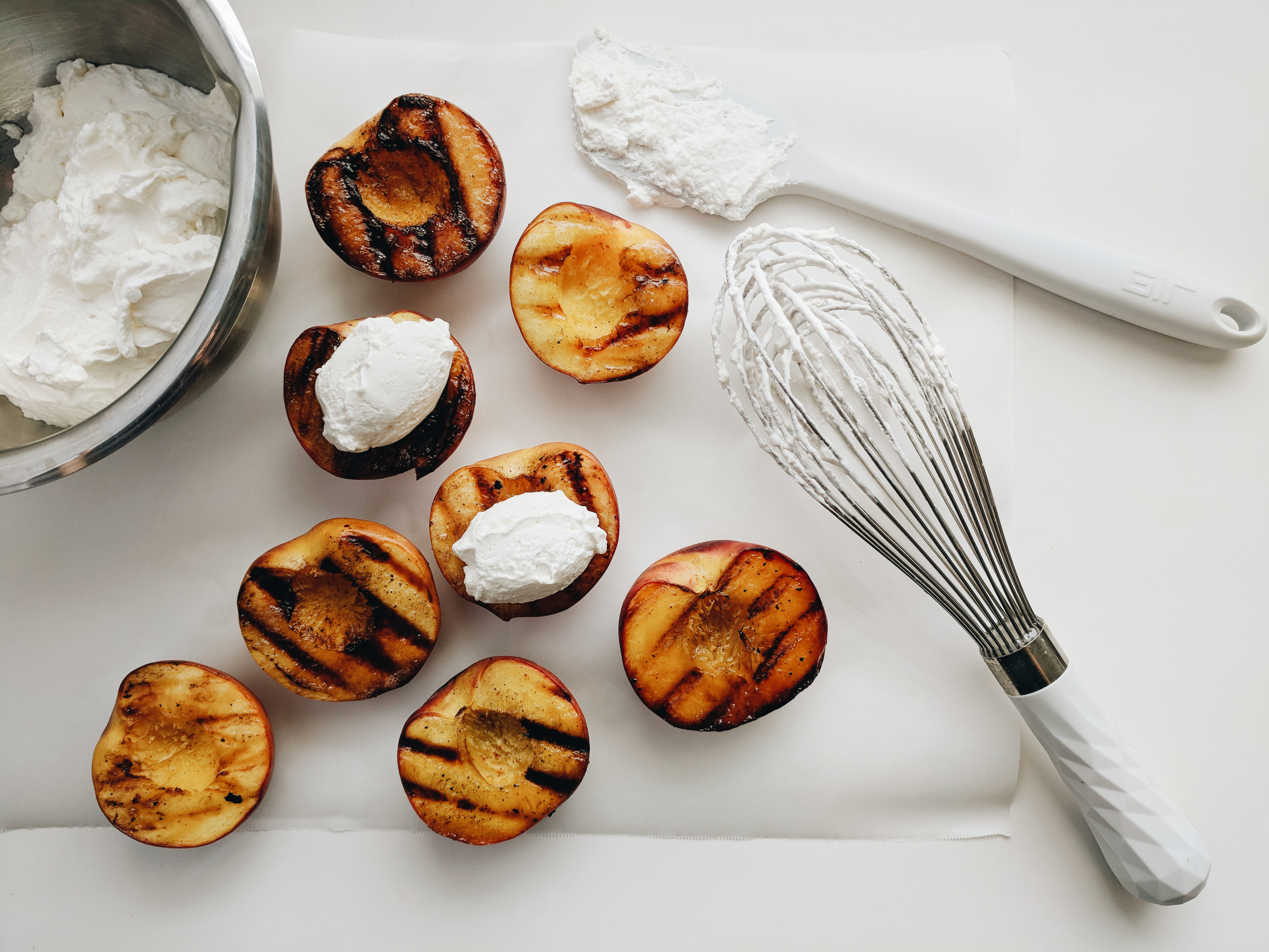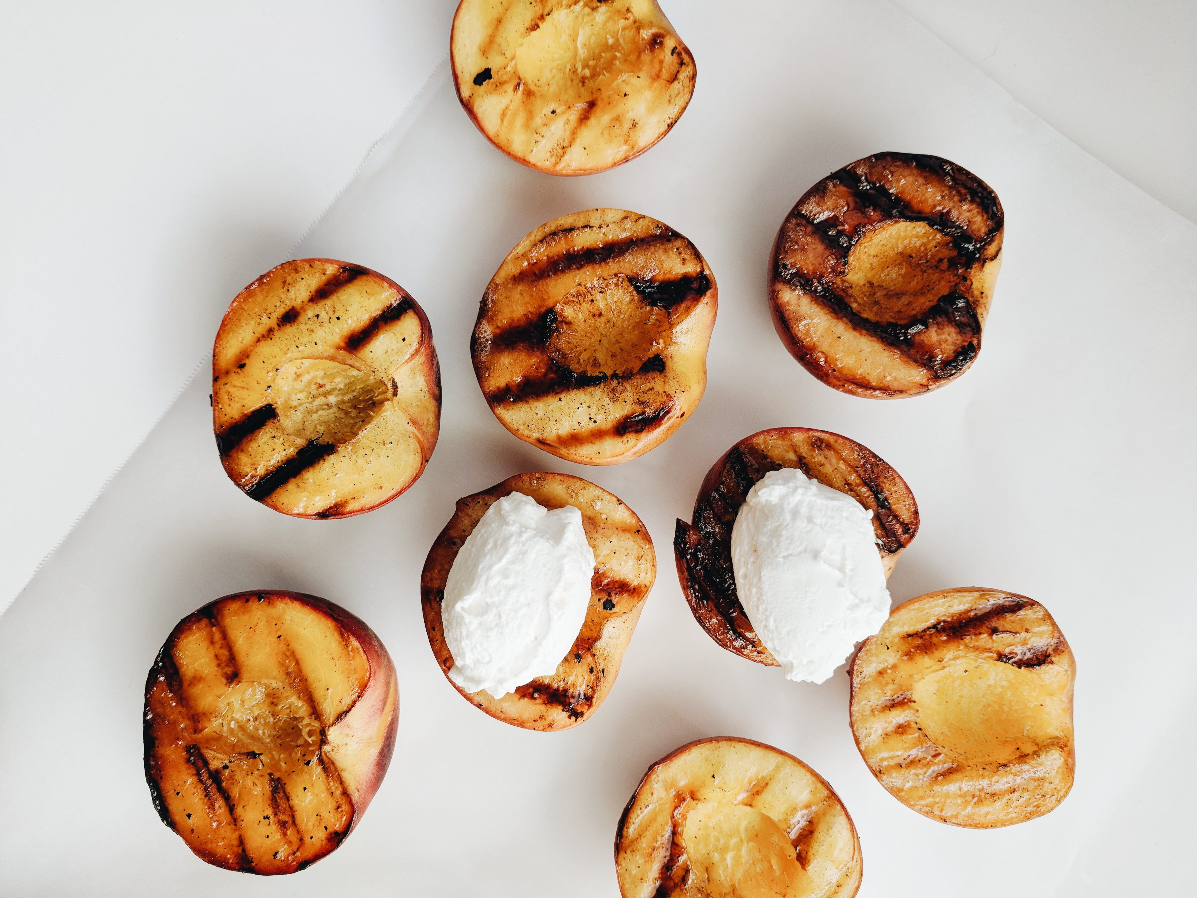 - Grease the grill with butter and place the peaches cut side up. Cook for 3 minutes, and remove from the grill. Grease the grill with butter again, and place the peaches cut side down. Without moving, cook for 5 minutes.