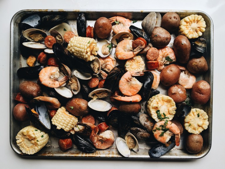 Literally boil a big pot of water, throw in a Zatarain’s crab boil spice bag, a bunch of Old Bay, a chopped lemon, a whole garlic, and a quartered onion. Add in a whole mess of red potatoes, corn, andouille sausage, mussels, clams, and shrimp – in that order. The end.