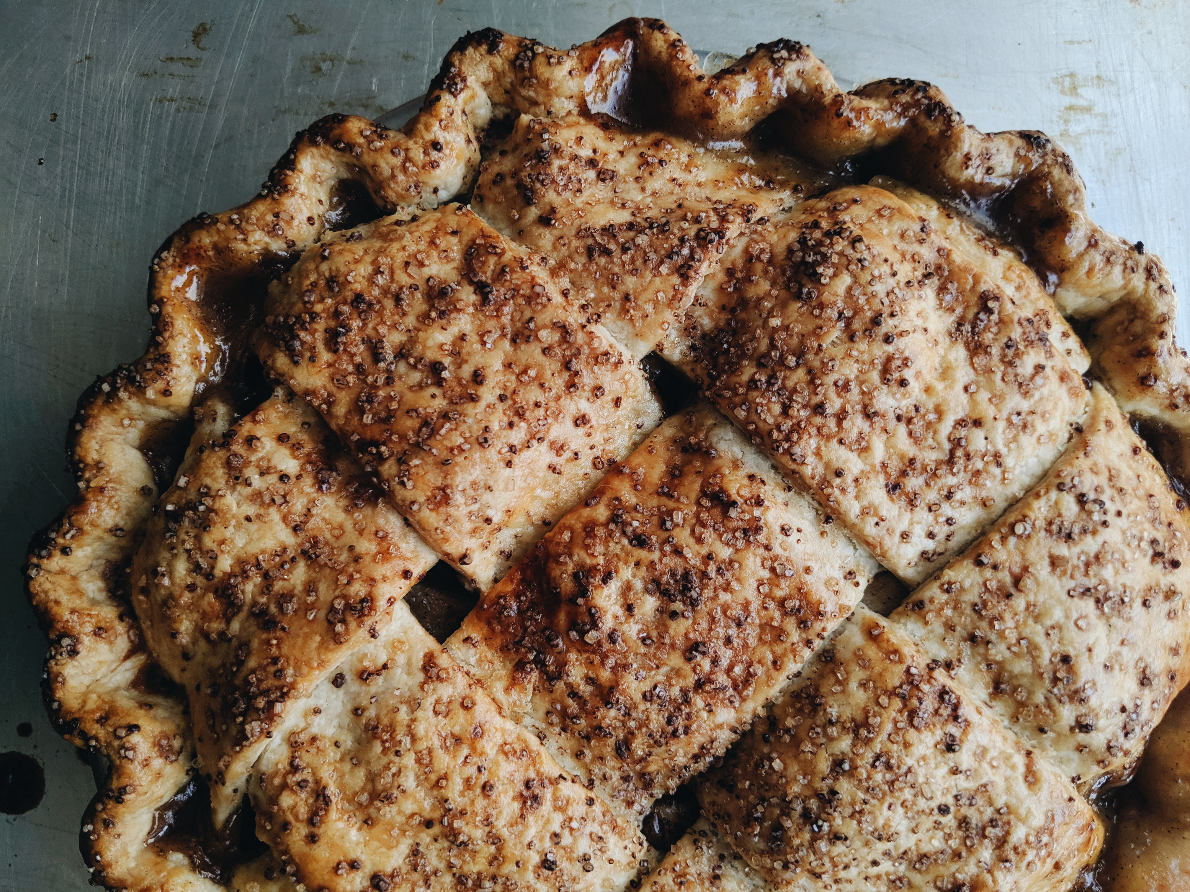 - Mix the apples with the thickened juice and pour into the prepared pie pan, being sure not to dome the apples too much. Arrange the top crust however desired.