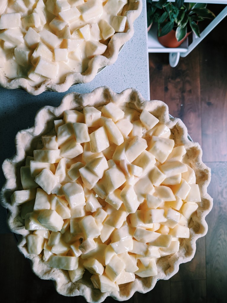 - Preheat the oven to 425°F. Peel, core, and dice the apples into roughly 1.5 cm x 1.5 cm cubes. Toss the apples in lemon juice, and drain in a colander. Whisk together the rest of the filling ingredients until smooth, and mix in the apple cubes until evenly coated.