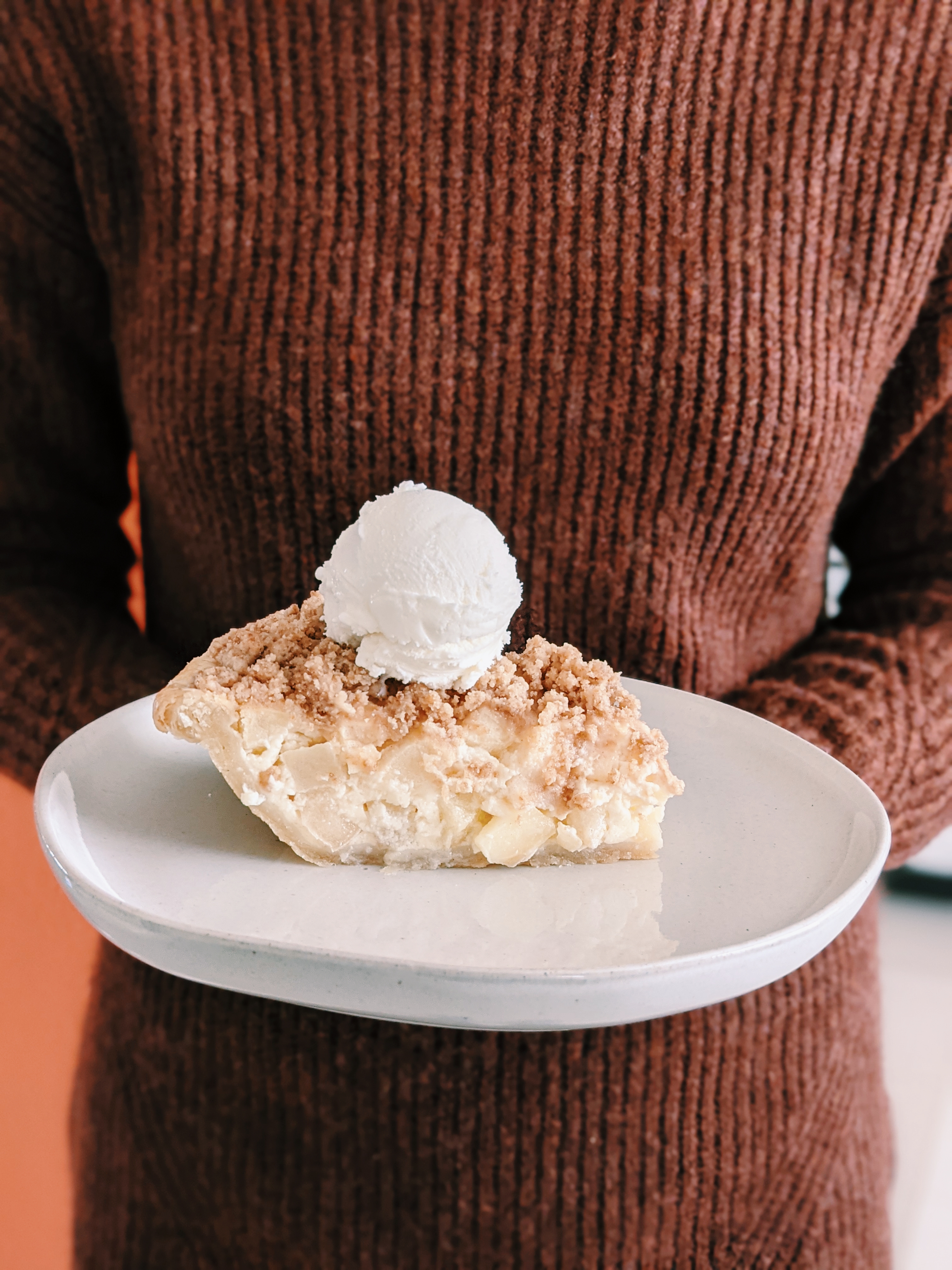 - Take the pie out of the oven. Lower the temperature to 375°F. Pack the streusel on top of the filling – use all of it! Return the pie to the oven and continue baking for 45-50 minutes, or until golden brown. Cover with foil if the streusel browns too quickly.